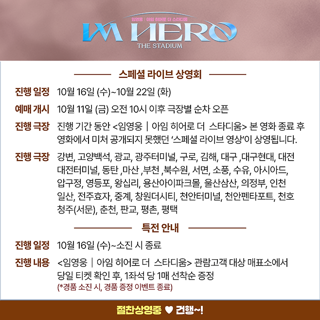 해당 상영을 관람하는 관객들에게는 역대 임영웅 콘서트 포스터를 담은 ‘아임 히어로 히스토리 씰’ 스티커도 증정하니 꼭 받아가시기 바랍니다.